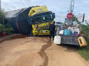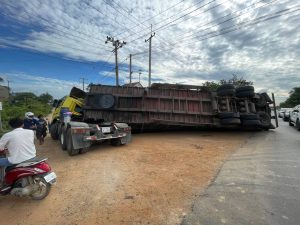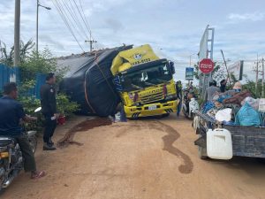 សំណាងណាស់ អត់សង្កត់លើអ្នកដំណើរ ខណៈរថយន្តដឹកធ្ងន់ពេកក្រឡាប់បះជើងនៅផ្លូវ១០៤ ខណ្ឌដង្កោ…