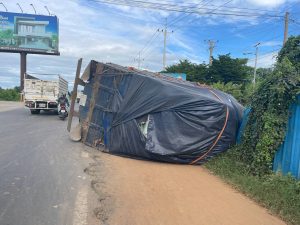 ភ្នំពេញ ÷ រថយន្តសណ្តោងមួយគ្រឿងដឹកគ្រាប់ជីធ្ងន់ពេកក្រឡាប់បះជើង សំណាងណាស់អត់សង្កត់លើអ្នកដំណើរ គ្រាន់តែរងការខូចខាតរបងផ្ទះប្រជាពលរដ្ឋតែប៉ុណ្ណោះ។
