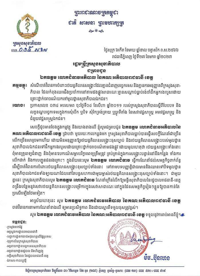 ក្រសួងសុខាភិបាល ស្នើឲ្យចាត់វិធានការចំពោះរថយន្ដគិលានសង្គ្រោះដែលគ្មានជំនាញបច្ចេកទេសនិងគ្មានកាអនុញ្ញាតពីក្រសួងដែលឈរជើងប្រចាំការតាមដងផ្លូវសាធារណៈ
