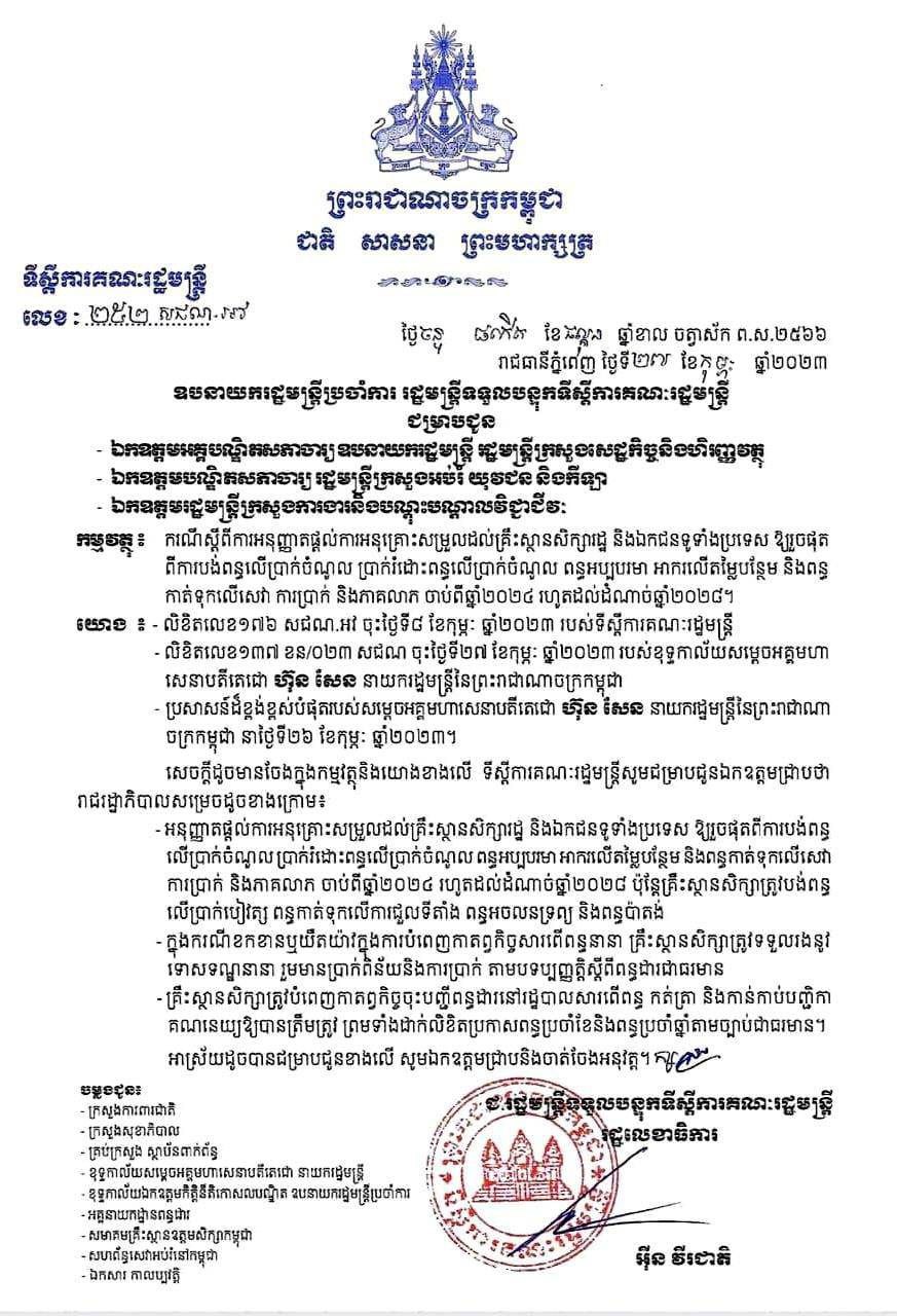 សម្ដេចតេជោ ហ៊ុន សែន នាយករដ្ឋមន្ដ្រីកម្ពុជា បានផ្ដល់ការអនុគ្រោះដល់គ្រឹះស្ថានសិក្សារដ្ឋ និងឯកជនទូទាំងប្រទេស ឱ្យរួចផុតពីការបង់ពន្ធលើប្រាក់ចំណូល ប្រាក់រំដោះពន្ធលើប្រាក់ចំណូល ពន្ធអប្បបរមា អាករលើតម្លៃបន្ថែម និងពន្ធកាត់ទុក លើសេវា ការប្រាក់ និងភាគលាភ ចាប់ពីឆ្នាំ២០២៤ រហូតដល់ដំណាច់ឆ្នាំ២០២៨។