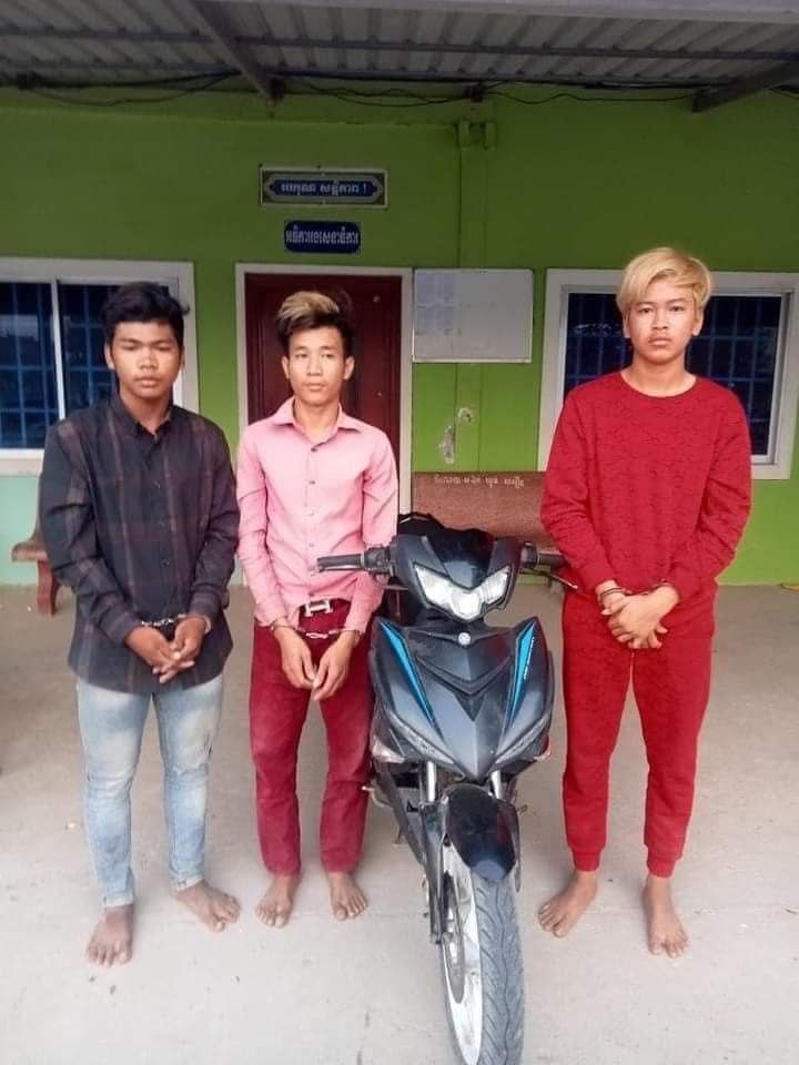 ទី៣ឈ្មោះហុឹម ប៊ុននី ហៅនុយ ភេទប្រុសអាយុ ១៩ឆ្នាំនៅភូមិពេជ្រចង្វា ឃុំបឹងត្រាញខាងត្បូង ស្រុកសំរោង ខេត្តតាកែវ ព្រមទាំងដកហូតវត្ថុតាងម៉ូតូម៉ាកអុិចសុិនទ័រពណ៌ខ្មៅគ្មានផ្លាកលេខចំនួន 0១គ្រឿង។ ចំណែកជនសង្ស័យ០២នាក់ទៀត ដែលកំពុងគេចខ្លួនរួមមាន កម្លាំងជំនាញបានកំណត់អត្តសញ្ញាណរួច មានទី១ឈ្មោះ សេង រ៉ានុត ភេទប្រុស អាយុ២៩ឆ្នាំនៅភូមិត្រពាំងវែង ឃុំបឹងត្រាញខាងត្បូង ស្រុកសំរោង និងទី២ឈ្មោះ ប្រាក់ ប្រុសពៅហៅស៊ុត ភេទប្រុស អាយុ ២១ឆ្នាំ នៅភូមិត្រពាំងវែង ឃុំបឹងត្រែងខាងត្បូង ស្រុកសំរោង។