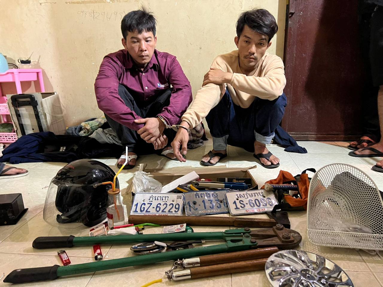 -ម៉ូតូម៉ាកស៊ុយហ្ស៊ុយគីនិច ពណ៌ ស ពាក់ផ្លាកលេខ ភ្នំពេញ1AC-2360ចំនួន ០១ គ្រឿង ,ដែកចុងស្រួចសម្រាប់កាច់សោកុងតាក់ម៉ូតូចំនួន ០២ ដើម និងសោខ្សៀររាងអក្សរអិល(L) ចំនួន ។ បន្ទាប់មកសមត្ថកិច្ចនាំជនសង្ស័យទៅធ្វើការត្រួតពិនិត្យបន្ទប់ស្នាក់នៅរបស់ជនសង្ស័យឈ្មោះ អាន ប៊ុនធុចនិងបន្ទប់ស្នាក់នៅរបស់បក្ខពួកឈ្មោះ ម៉ាប់ ផ្ទះជួល ផ្លូវលំ សង្កាត់ទួលសង្កែ១ ខណ្ឌឬស្សីកែវ រាជធានីភ្នំពេញ រកឃើញនិងចាប់យកវត្ថុតាងបញ្ជូនមកការិយាល័យដើម្បីចាត់ការតាមនីតិវិធីមាន៖ វ៉ាលីម៉ាកSaint ពណ៌ ទឹកប្រាក់ ចំនួន០១ ,-ផ្លាកលេខម៉ូតូចំនួន០៣ ផ្លាកលេខសៀមរាប1S-6096,ផ្លាកលេខភ្នំពេញ 1GZ-6229ផ្លាកលេខកំពង់ស្ពឺ1C-1336ដាវកែច្នៃ ពណ៌ ស ចំនួន០១ដើម ,ឧបករណ៍សំរាប់ដោះ និងកឹបផ្លាកលេខម៉ូតូមួយចំនួន ,-ឧបករណ៍កែច្នៃសំរាប់កាច់បំបែកគ្រាប់សោរកម៉ូតូមួយចំនួន ,ម៉ូទ័រសំរាប់កាត់ដែក ចំនួន០១គ្រឿង ,កន្ត្រៃសំរាប់កាត់ដែក ចំនួន០១ និងពូថៅ ចំនួន០១ដើម ,គ្រឿងបន្លាស់ម៉ូតូមួយចំនួន ,ឧបករណ៍សំរាប់ប្រើប្រាស់គ្រឿងញៀនមួយចំនួន ។