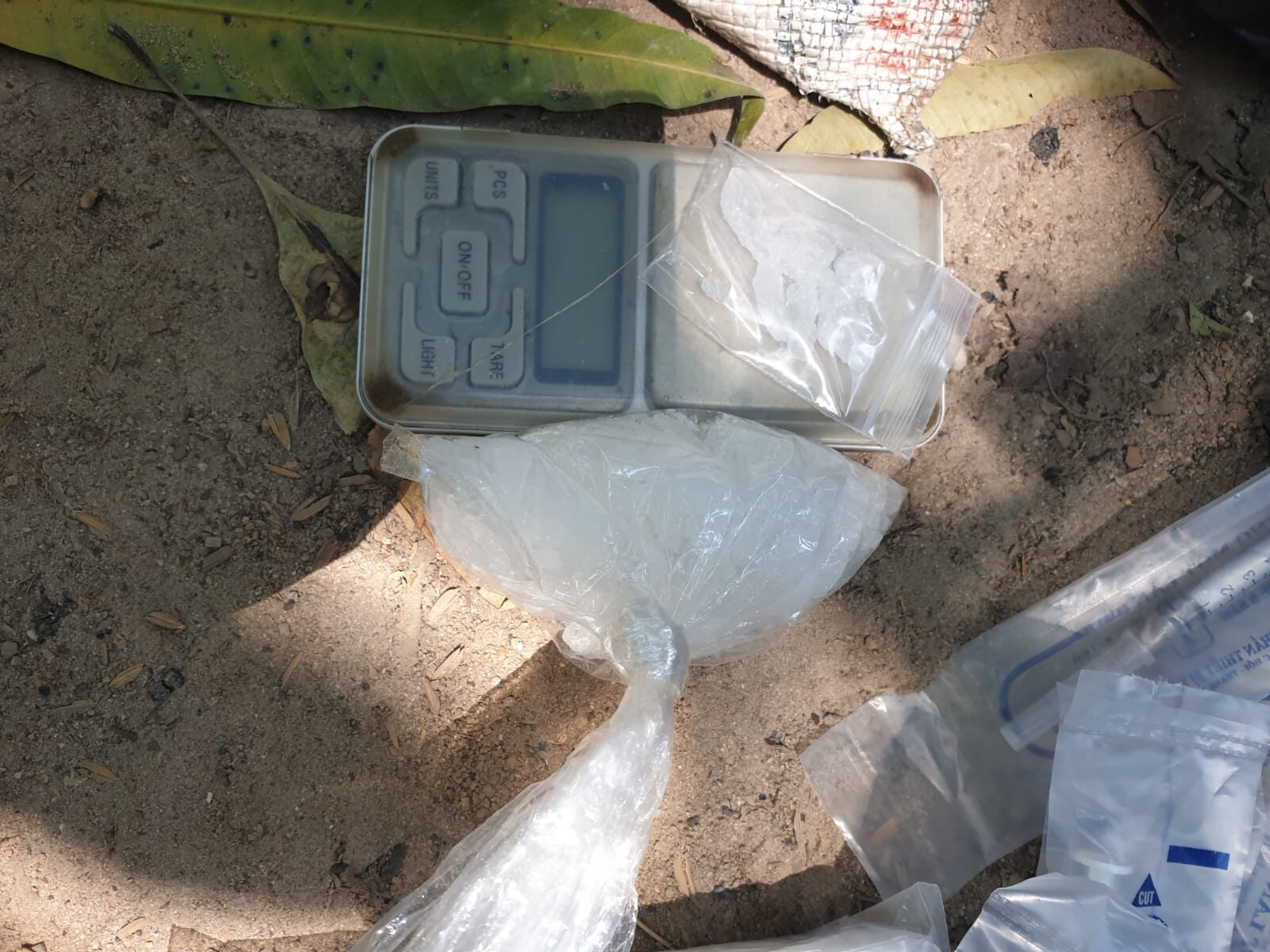 - – ម្សៅក្រាមថ្លាព៌ណសចំនួន២កញ្ចប់និង ថង់សំរាប់វិចខ្ចប់ថ្នាំញៀនមួយចំនួន។
