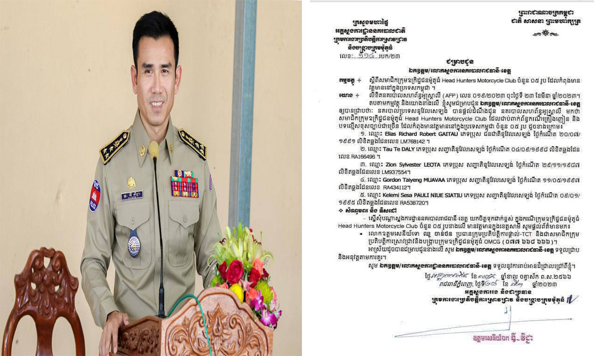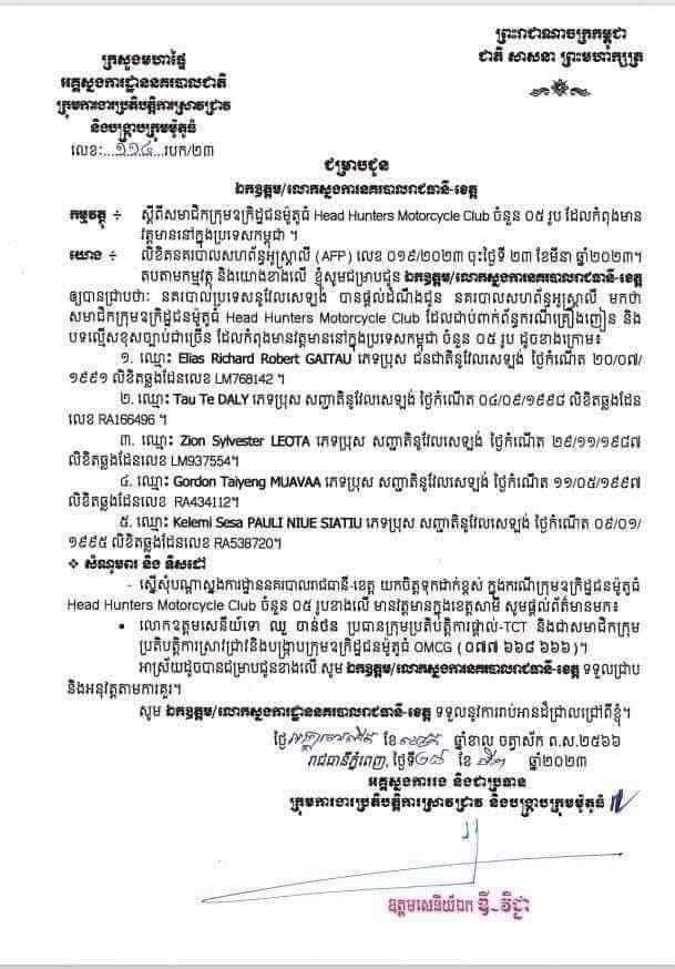 ភ្នំពេញ ៖ នគរបាលប្រទេសនូវែលសេឡង់ បានផ្ដល់ដំណឹងជូន នគរបាលសហព័ន្ធអូស្ត្រាលី មកថា សមាជិកក្រុមឧក្រិដ្ឋជនម៉ូតូធំ Head Hunters Motorcycle Club ដែលជាប់ពាក់ព័ន្ធករណីគ្រឿងញៀន និង បទល្មើសខុសច្បាប់ជាច្រើន ដែលកំពុងមានវត្តមាននៅក្នុងប្រទេសកម្ពុជា ចំនួន ០៥ រូប ។ នេះបេីយោងតាមលិខិតលេខ ១១៤ របក/២៣ ចុះថ្ងៃទី ២៣ ខែ មីនា ឆ្នាំ ២០២៣ ដឹកនាំដោយឯក ឧត្តម ឌី វិជ្ជា អគ្គស្នងការរងនគរបាលជាតិ និងជាប្រធានក្រុមការងារប្រតិបត្តិការស្រាវជ្រាវ និងបង្ក្រាបក្រុមម៉ូតូធំ។ ឧត្តមសេនីយ៍ឯក ឌី វិជ្ជា ស្នេីទៅកាន់មេប៉ូលីសរាជធានី-ខេត្ត ត្រូវរាយការណ៍ព័ត៌មានជូនថ្នាក់លេីបេីឃេីញមុខសញ្ញាក្រុមឧក្រិដ្ឋជនម៉ូតូធំ កំពុងរស់នៅលេីទឹកដីនៃខេត្តសាម៉ីរបស់ខ្លួន ។ សមាជិកក្រុមឧក្រិដ្ឋជនម៉ូតូធំ Head Hunters Motorcycle Club ដែលជាប់ពាក់ព័ន្ធករណីគ្រឿងញៀន និង បទល្មើសខុសច្បាប់ជាច្រើន ដែលកំពុងមានវត្តមាននៅក្នុងប្រទេសកម្ពុជា ចំនួន ០៥ រូប ដូចខាងក្រោម៖ ១. ឈ្មោះ Elias Richard Robert GAITAL ភេទប្រុស ជនជាតិនូវែលសេឡង់ ថ្ងៃកំណើត ២០/០៧/ ១៩៩១ លិខិតឆ្លងដែនលេខ LM768142 ។ ២. ឈ្មោះ Tau Te DALY ភេទប្រុស សញ្ជាតិនូវែលសេឡង់ ថ្ងៃកំណើត ០៤/០៩/១៩៩៨ លិខិតឆ្លងដែន លេខ RA166496 ។ ៣. ឈ្មោះ Zion Sylvester LEOTA ភេទប្រុស សញ្ជាតិនូវែលសេឡង់ ថ្ងៃកំណើត ២៩/១១/១៩៨៧ លិខិតឆ្លងដែនលេខ LM937554។ ៤. ឈ្មោះ Gordon Taiyeng HuAVAA ភេទប្រុស សញ្ចាតិនូវែលសេឡង់ ថ្ងៃកំណើត ១១/០៥/១៩៩៧ លិខិតឆ្លងដែនលេខ ( RA4341 12។ ៥. ឈ្មោះ Keleml Ses PALLI NIUE SIATIU ភេទប្រុស សញ្ជាតិនូវែលសេឡង់ ថ្ងៃកំណើត ០៩/០១/ ១៩៩៥ លិខិតឆ្លងដែនលេខ RA538720។ សូមបញ្ជាក់ថា សមាជិកក្រុមឧក្រិដ្ឋជនម៉ូតូធំ Head Hunters Motorcycle Club ដែលកំពុងតែរស់នៅប្រទេសកម្ពុជា ជាប់ពាក់ព័ន្ធករណីគ្រឿងញៀន និង បទល្មើសខុសច្បាប់ជាច្រេីនផ្សេងទៀតផងដែរ៕