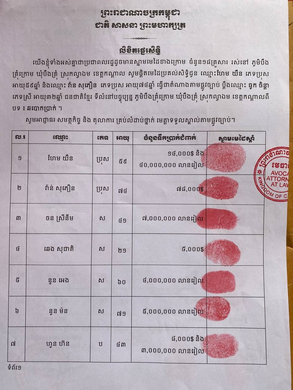 តំណាងប្រជាពលរដ្ឋ ១៨គ្រួសារ នៅល្វាឯម សំណូមពរ ចៅក្រម ជំនុំជម្រះនៃសាលាដំបូងខេត្តកណ្តាល និង រដ្ឋមន្ត្រីក្រសួងយុត្តិធម៌ ជួយផ្តល់យុត្តិធម៌ ករណីឆបោកប្រាក់ ជិត២០ម៉ឺនដុល្លារ …
