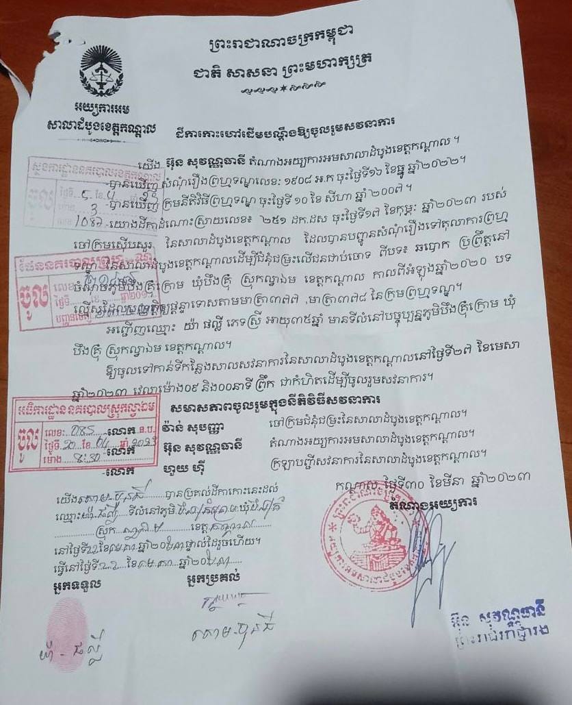 ខេត្តកណ្ដាល៖ សំណុំរឿង ឆបោកប្រាក់ ជិត២០ម៉ឺនដុល្លារ ពីប្រជាពលរដ្ឋចំនួន១៨គ្រួសារ រស់នៅឃុំបឹងគ្រុំ ស្រុកល្វាឯម ដែលប្រព្រឹត្តដោយ ជនជាប់ចោទ ឈ្មោះ ធូក ចិន្តា ជាអតីតនគរបាលប៉ុស្តិ៍ឃុំបឹងគ្រុំ និងក្រោយមកផ្ទេរចេញមកជា មន្ត្រីនគរបាលការិយាល័យប្រឆាំង បទល្មើសគ្រឿងញៀន នៃស្នងការដ្ឋាននគរបាលខេត្តកណ្តាល ដែលត្រូវជាកូនស្រីរបស់ លោក ជា ថុល អតីត អធិការនគរបាលស្រុកល្វាឯមដ៏មានឥទ្ធិពល នឹងត្រូវលើកយកមកបើកសវនការជំនុំជម្រះដោយ លោកចៅក្រម វ៉ាន់ សុបញ្ញា និង លោក អ៊ុន សុវណ្ណធានី ជាតំណាងអយ្យការ នៅព្រឹកថ្ងៃទី២៧ ខែមេសា ឆ្នាំ២០២៣។