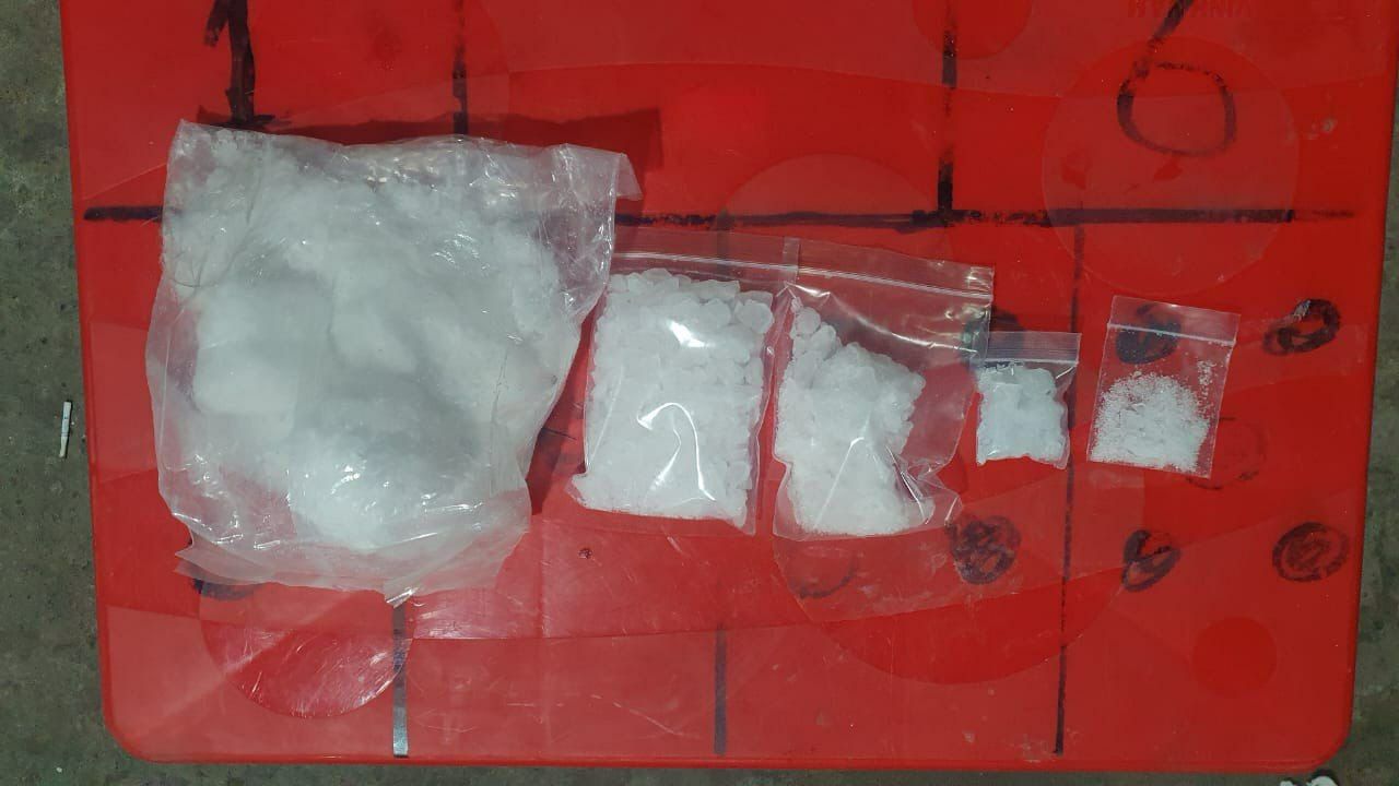 – ក្រាមពណ៍សរថ្លា(សង្ស័យជាគ្រឿងញៀន) ចំនួន ០៥ កញ្ចប់ (ធំ០៣ និងតូច០២)